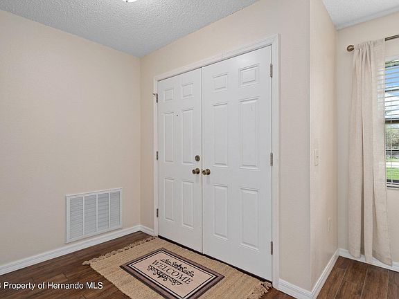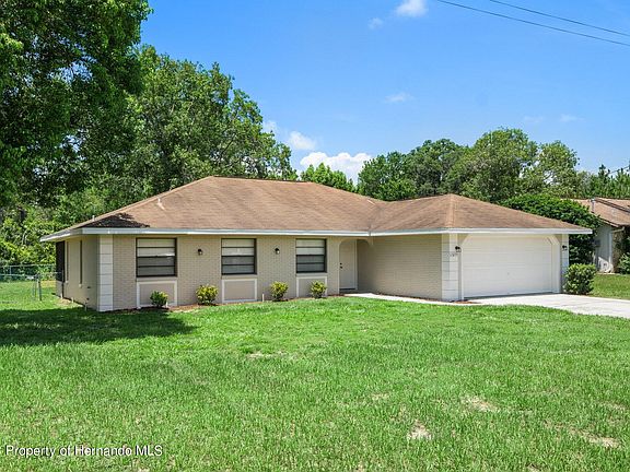 Welcome to this exquisite 3-bedroom, 2-bathroom, 2 car garage home, boasting a grand double entry door that sets the tone for the elegance that awaits inside. 1807 sq ft. The spacious kitchen is complete with a convenient breakfast bar, stainless steel appliances, beautiful wood cabinets, a stunning stone backsplash, and luxurious granite countertops, creating a perfect blend of style and functionality. The cathedral ceiling and open floor plan create an airy and inviting ambiance, making this home the ideal space for entertaining family and friends. The master bathroom is a true retreat, featuring a double sink vanity, a walk-in tiled shower, and a generous walk-in closet. With a thoughtfully designed split bedroom floor plan, privacy is ensured for everyone in the household. The screened lanai, accessible through sliding doors from the master bedroom, dining room, and living room, invites you to relax and savor the beauty of the outdoors while enjoying a refreshing breeze. Step outside to the nice-sized fenced backyard, offering a private oasis that backs up to nature, providing a tranquil and serene setting. A handy storage shed adds convenience and ensures a clutter-free living space. The interior of the home has been freshly painted 7/26/2023 giving it a pristine and updated look. No carpet. Granite counters in kitchen and baths. Major updates, including a 1-year-old septic and drain fields, and a 2019 HVAC system, offer peace of mind and low-maintenance living. Immerse yourself in the finest Florida living experience as you unwind and enjoy the perks of this impeccable home. It's the perfect place to make lasting memories and embrace the unparalleled charm of Florida living. Welcome home! Roof will be replaced by owners before closing.