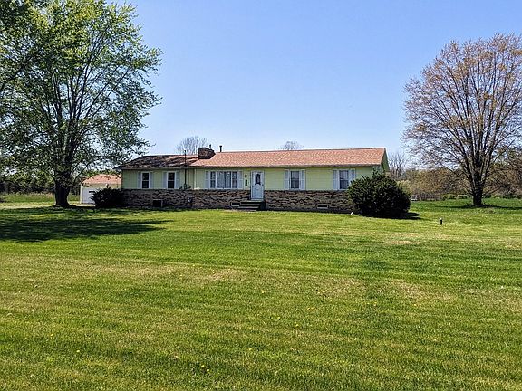 Well built ranch home with full basement on 5 acres with oversized 2 car attached and 3 car detached garage. Open layout with 3 spacious bedrooms and 1.5 baths. Large living room with gas fireplace. 1st floor laundry. Full basement with wood-burning stove. Lot has mature trees and 1/3 acre pond. Home needs some updating and is priced accordingly.