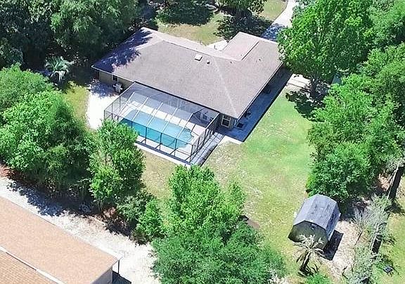 Spacious, well-maintained pool home w/ over 2800 sq ft of living space and open floor plan w/ vaulted ceilings. A secondary gravel drive leads to the 1800 sq ft detached 30x60, 6 CAR GARAGE (including an RV door) at the rear of property. Inside is a game room or guest quarters complete with loft and full bathroom. Garage was constructed to also serve as a safe room, blocks were filled with rebar and concrete to withstand severe weather. This property boasts 3 beds and 3 baths in the main house with dining room, breakfast bar, breakfast nook, large office & sunroom. Outside offers an inground pool inside the newly screened lanai, irrigation system with private well, storage sheds, privacy fenced yard and timed security lighting. Double hung, double pane Simonton windows, new water heater 2016, new A/C 2011, exterior paint 2013, interior paint and new carpet in 2016. Original tile roof was replaced with new shingle roof approx 13 years ago under warranty. Very clean, easy to show.