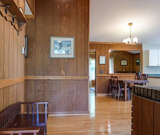 One story 70's contemporary on beautiful, shaded lot with mature trees. Light filled open layout with vaulted ceilings and skylights. Hardwood floors, big windows and private back patio. Den would make a great creative studio space. Whole house water filtration system.