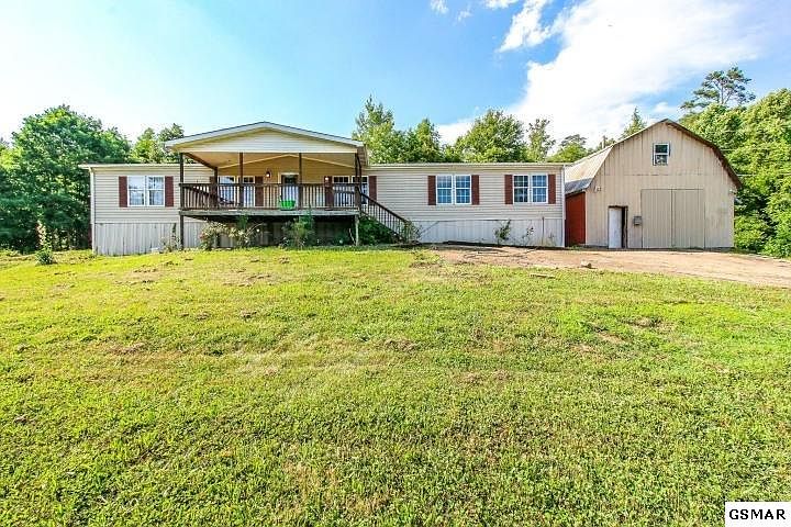 This double wide home has a country view. Large covered porch on front and large wood deck on backside. Home will surprise you with all the space with living room, master bedroom suite, kitchen is very large with pantry/laundry located off kitchen. Family den with wood burning fireplace! Total 5 bedrooms and three full baths but home septic permit for 3. Chicken coop conveys and also included a two story work shop/garage/ detached. Location is convenient to Douglas Lake areas, Pigeon Forge attractions, Smoky Mtns and City Life of Knoxville.