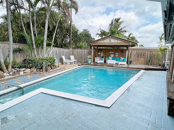 3/2 pool home located with easy access to I95 and Lake Osborne. Private fully fenced backyard perfect for entertaining with wood deck, gazebo and an enclosed summer kitchen including a smoker, all surrounded with tropical landscaping and a bonus outdoor shower. Pool comes with auto pool vac. Irrigation system supplied by well. Home is pre-wired for both security cameras and speakers. Open spacious open floorplan with crown molding. Kitchen equipped with stainless steel gas stove top, dishwasher, refrigerator and double gas wall oven. Home has smart switches as well as touch screen upgraded ac thermostat and ring doorbell. Home has separate laundry room including a gas washer/dryer. Flat roof done 2019 with 10 yr warranty.