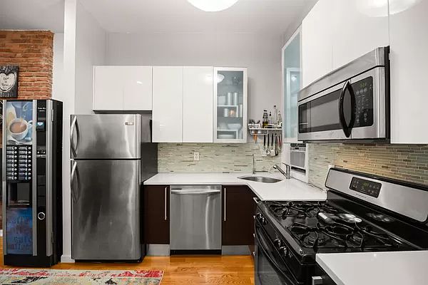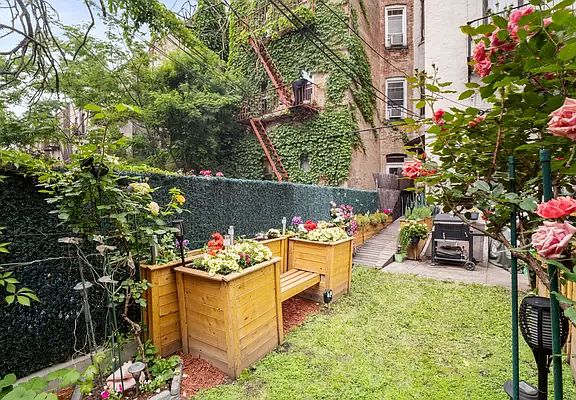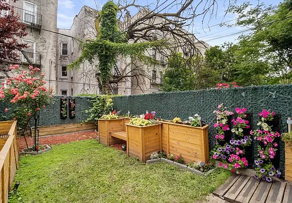 Two Bedroom 1.5 Bath Floor-Thru Home premiers a Private Garden Oasis, L-shaped Kitchen with stainless steel appliances, exposed brick in the living room, washer/ dryer in unit, deep closets, 10' ceilings with recessed lighting and hardwood floors throughout compliment this home. Below please find our garden features: 13 custom raised bed planters for flowers, plants, fruits, vegetables and herbs Integrated watering system (for lawn, flower pots and planters) on a timer Solar powered owl to repel rodents and pests Rose bushes Grape plants Sitting area with a wall mounted heater for use during the cold months Wall mounted adjustable shelving for plant pots and more Deeded 10x10 storage room is included. This Boutique Condominium Residence only has six units and is self-managed with amazingly low common charges. There is also a washer/ dryer Unit located in the Lower-Level Communal Space that is complimentary to all Residents. Conveniently located in close proximity to neighborhood gems such as Parks and Playgrounds, Grocery Stores, Restaurants and a short stroll to Express Subway Line.