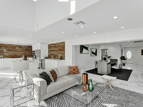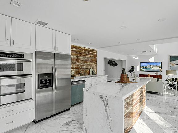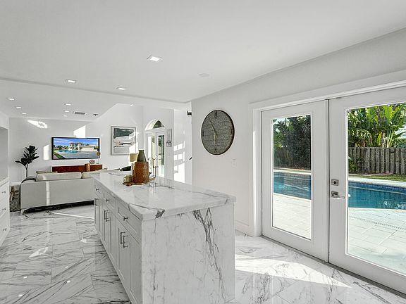 Indulge in this luxurious mid-century modern, yet fully renovated oversized lot pool home in the highly desirable Boca Square in east Boca Raton minutes to Mizner Park and the beach. Rare stones and marble create visual appeal! This bright and airy 3 bedroom and 2 bath split floor plan home plus 2 bonus rooms is a rare opportunity with white marble floors throughout and a chef's delight kitchen with French doors makes entertaining by the pool a breeze. The opulent kitchen includes a large waterfall island with Calcatta marble countertops, full Onyx backsplash, white shaker cabinets, new stainless steel appliances including a double oven, refrigerator, dishwasher and large sink. The large primary bedroom includes an oversized walk-in closet. Indulge in pure serenity in the supremely stylish primary bathroom with a free standing tub, large rain shower with Nero Marquina marble title, double floating sink vanity, and led light mirrors. Get cozy by the Grigio Petrolio marble fireplace in the living room and enjoy a oversized laundry room with new washer/dryer, sink, closet and cabinet space. Both guests rooms have French doors leading to the marble title patio, large pool with an outdoor shower and lush landscaping. Marvel at the guest bath which is an art piece with multi color onyx from floor to ceiling. House includes a basement (YES that's right) perfect for a wine cellar, music studio or office. An open loft can be used as a reading nook or office. A+ rated school district.