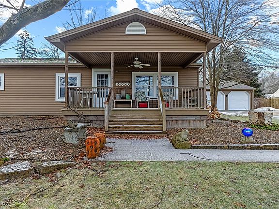 Looking for a country setting? How about four glorious partially wooded acres! This manufactured home is remodeled, well cared for and offers more than you might guess from a glance! Drive in on a single lane updated concrete driveway that widens into a four plus car wide parking area in front of the huge 3 car detached garage! The covered front porch gives you peaceful views from your front yard, and the back yard even has a huge pavilion for entertaining! The home itself is well kept, and gives a cottage/ cabin feel of warmth when you walk in. Foyer and closet at your entrance leads to the carpeted, neutral and warm living room. Sparkling clean windows allow an abundance of natural light to flood in from all parts of this open floorplan. Wood accent wall showcases your entertainment area, wooden shelves and handmaid valances complete the look in this welcoming living room The modern updated kitchen has wood cabinets,neutral countertops and the rustic wood LVT flooring flow from kitchen to the large dinette. Yes! The beautiful sink faces a window so you can watch nature as you meal prep and do your kitchen chores! Great extra pantry storage to each side of the updated fridge and a pantry closet as well! Plenty of cabinets and counterspace. A Built in microwave, electric stove, dishwasher and fridge, all stainless & newer, will stay. Nice overhead chandelier for evening meals over the dinette table, during the day the natural light and outside views can also be enjoyed here! All three bedrooms are well kept and have ample closet space, all doors have been updated thru out the home as well. Updated full bath with all the modern finishes! Extra area to get ready in the morning with great counter space. The First floor laundry combined with a mudroom finishes the space, and there is a back entry porch leading to the garage and the backyard. The 3 car garage has triple single doors. Central Air. Propane Heat. Septic and well. Call today to view this lovely home.