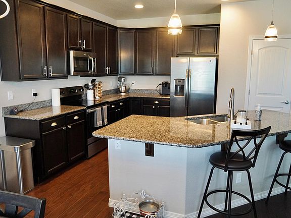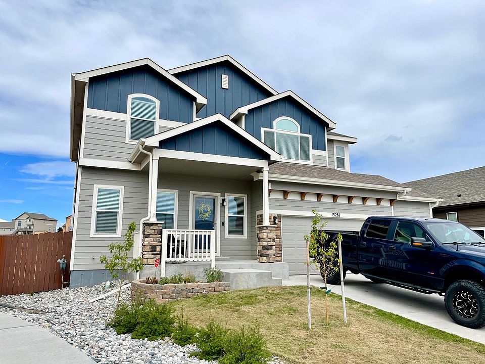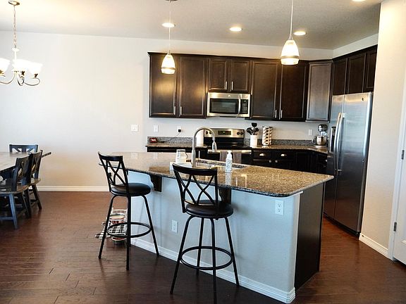 Meridian Ranch! Great Curb Appeal. Open inviting 6 bedroom, 3.5 bath, 4car garage. As you walk into this beauty with hardwood floors, Office area, Nice Living Room with Gas Fireplace which opens to eat in Kitchen with Stainless Steel Appliances, Granite Countertops and Quartz, New Ceiling Fans, and half bath on main level. The Upper Level has 4 large Bedrooms with Upper Level Laundry for Convenience. The Master Bedroom is Huge with 2closets and a 5 piece Bath. Finished Basement perfect for entertaining or guest has a Family Room with 2 additional Bedrooms and a Full bath. 20 minutes to the base.