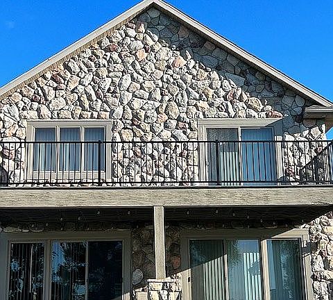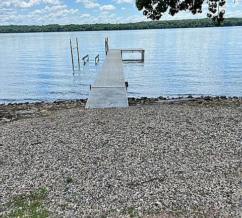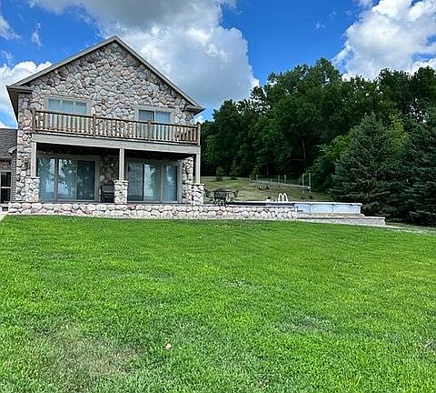 Lake living and beautiful views at its best in this custom built year-around home with 4-car garage, a heated pool and 153 ft of lake shore across the road. Main floor is open concept with 2-story stone fireplace, large breakfast bar, kitchen with granite countertops, hickory cabinets, dining, bedroom, full bath with quartz top, and laundry room. Second floor has 2 bedrooms, full bath with quartz top and loft area used for additional sleeping area for family and friends. Plenty of storage space with 2 large closets in back hallway. Docks and pontoon lift included. Lot size is 1 acre. New maintenance free deck railing. Steel siding and Stone front.
