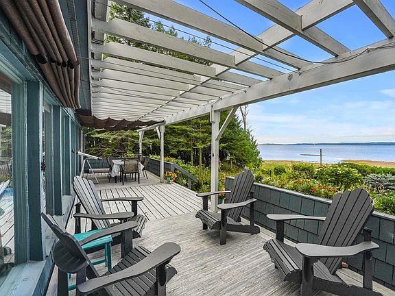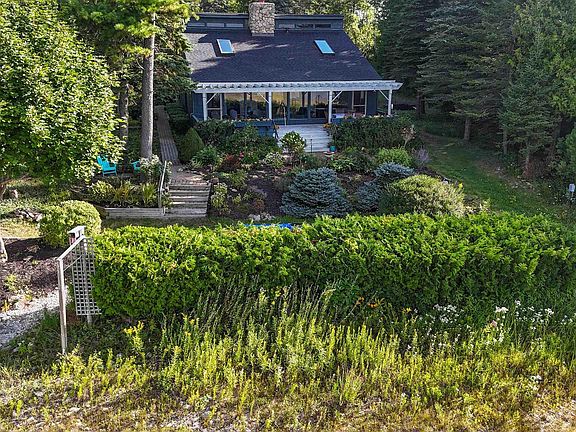Located on Paradesia Point, one of Leelanau Peninsula's most desirable lakefront locations, this beautiful three-bedroom/three-bathroom home hasn't been on the market since it was custom-built in 1985. With sweeping views,1.22 acres, and 180 feet of direct frontage on Grand Traverse Bay, the charming 3,500-square-foot home is an architectural treasure, complete with two-story stone fireplace, vaulted ceilings, skylights, old-growth wood paneling, spiral staircase with hand-hewn logs, and a wonderful glass atrium entrance. The crowning glory is its oversized four-season porch that opens to an additional full-length covered back porch, offering unmatched, unobstructed views of Lake Michigan. The open kitchen, which includes Wolf range, Sub Zero fridge, stainless steel GE dishwasher, and custom cabinetry, opens to a large family room and dining room, all with lovely lake views. The sizeable first-floor primary suite includes its own sitting room and additional stone fireplace, as well as ensuite bathroom and walk-in closet. The two bedrooms upstairs share a jack-and-jill bathroom plus a spacious, light-flooded loft for guests or an additional living area/flex area. Surrounded by gardens, winding paver walkways and a gazebo with 220v. Attached two-car garage with EV hookup, 220 outlet and electric garage door opener. This energy-efficient home is equipped with geothermal heating and cooling, and there's a separate split for the large atrium entrance. Located three miles north of downtown Northport on a scenic, winding road, the home is close enough to town to be convenient, yet offers the perfect balance of privacy and seclusion for a peaceful retreat.
