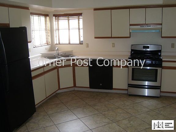 Three Bedroom, 2.5 Bathroom, two-story home in North Hills, Rio Rancho. Lovely Entryway into Living room. Ceramic-tiled Kitchen with matching black appliances--stove, refrigerator and dishwasher, Pantry and Eating area. Formal Dining room. All Bedrooms are upstairs. Master Bath with large shower and walk-in closet. New carpet and wood laminate floors. Ceiling fans throughout. Washer/dryer included. Two-car garage. Gas furnace and evaporative cooling. Fully fenced back yard with covered patio.