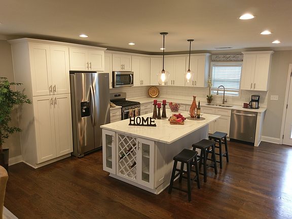 - Kitchen Features: Eat-in Kitchen, Pantry, View to Family Room, Stone Counters, Kitchen Island, Cabinets Other, Cabinets White, Wine Rack