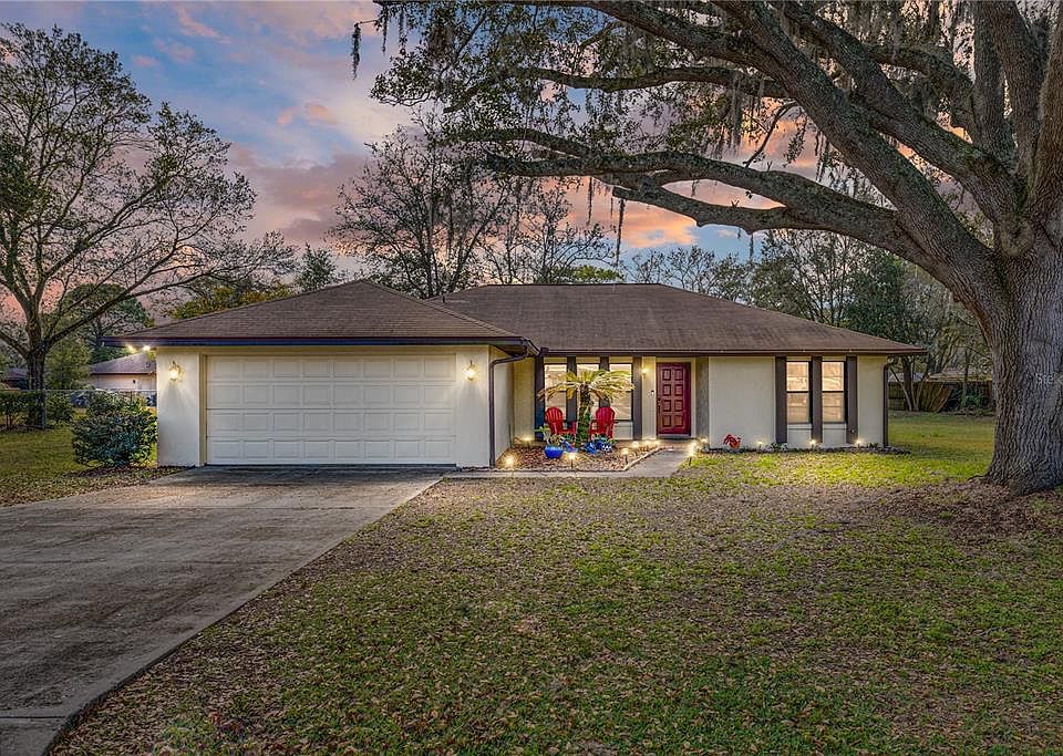 Welcome home to Timberidge, an established north Lakeland neighborhood with no HOA. Nestled near the end of the cul-de-sac, you will find this lovely, well maintained 3 bedroom, 2 bathroom home situated on a large tree-covered lot. Featuring newer luxury vinyl plank flooring throughout, vaulted ceilings and a large living room leading out to your screened-in patio, you instantly feel at home as you walk in. With a formal dining room you can entertain plenty of guests. The main bedroom features an en-suite bathroom for your convenience alongside a walk-in closet with ample space. This split floor-plan home offers a spacious second and third bedroom with a second bath featuring a tub/shower combo. The two-car garage features plenty of space for parking as well as the the washer and dryer, which are included. Spend the evenings lounging on your screened-in patio overlooking the large back yard in this peaceful neighborhood. Timberidge is conveniently located close to an array of shopping and I-4 access. New exterior lighting, all outlet covers updated, septic pumped at the end of 2022 and roof is approximately 5-6 years old. Call to schedule your private showing today!