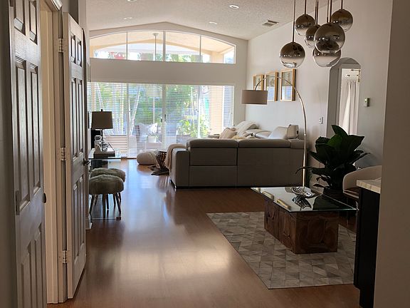 This waterfront home is move in ready and features plenty of upgrades and great for entertaining. The home has a covered 27'x10' covered patio with a screened cathedral ceiling. Continuous stamped concrete from the rear exit of the home to the lake sea wall for a low maintenance rear. Updated bathrooms. Updated lighting and recessed lighting throughout. Lots of storage, master walk in closet. Separate laundry room with built in storage. Large kitchen with pantry. Upgraded high traffic laminate. Hurricane shutters. Close to turnpike, shopping, and dining .