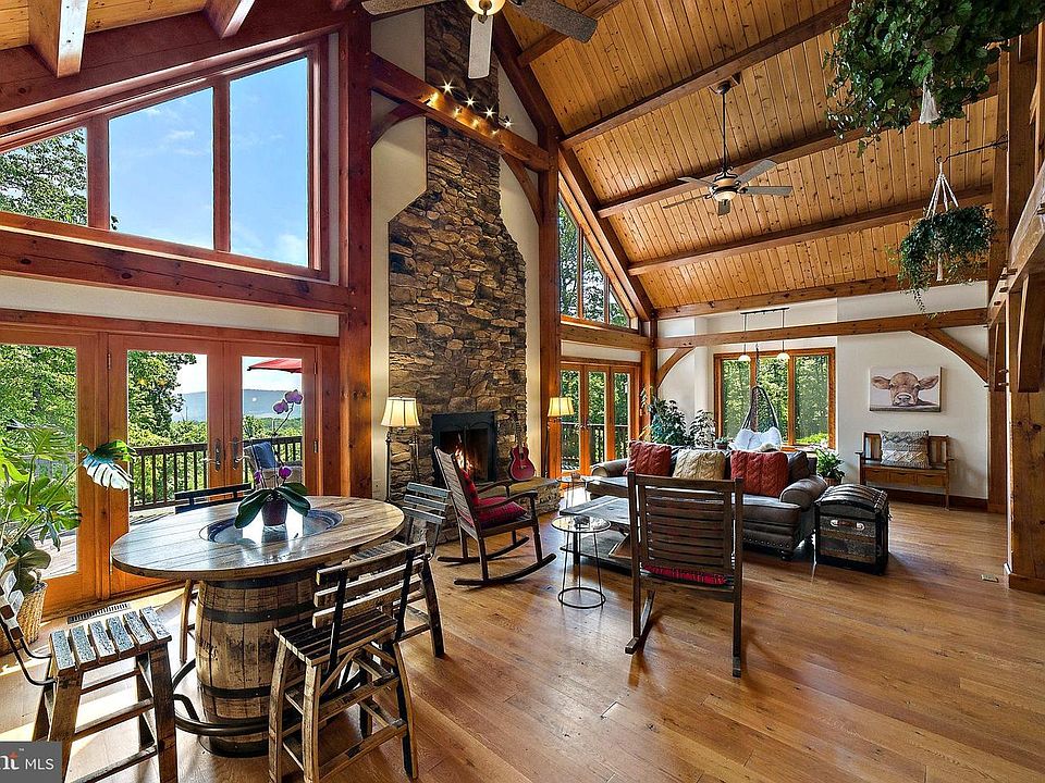 NEW PRICE. BRING OFFERS! This Awe-Inspiring Custom-built 4049 Sq Ft of Pegged Post and Beam Crafted Solid Construction lays out a masterfully designed 5 Bedroom/ 4 Bath Mountain Lodge-Style Retreat with Eastern Loudoun County Panoramic Views. Situated on 25.31 Forest Protected Private Acres backs to the Appalachian Trail. All season views can be seen from each of the interiors 3 fabulously finished levels but mostly enjoyed off of the extensive wrap around deck. Palladian Windows capture morning and afternoon sunlight while also sharing natures bounties throughout this surprisingly open flowing floor plan. One is quietly transcended into pampered luxury when combining the Foyer, continuous 3 level dramatic hardwood Staircase, Gourmet Kitchen, Breakfast, Dining and Living Room areas. A Soaring 22 beamed cathedral ceiling showcases a two-story stone-built wood burning fireplace with a raised hearth. There are 2 main level guest bedrooms peacefully tucked away in the rear portion of the home. Perched high among the rafters in the upper level is an Office/ Library Loft and Private Owners Quarters with an earthy skylit En-suite, walk-in his and her closets as well as its own personal 8 x 8 ft Deck shaded by mature trees. The lower walk-out ground level is host to the large recreation family room with a second stone-built fireplace housing an energy efficient wood burning stove. An entertainment bar with a small kitchenette, two additional guest bedrooms, full roll-in shower bath as well as a spacious laundry utility storage room help to complete this exceptional living space. The exterior is accessible through flanking sliding glass doors leading to a stone patio below upper deck and an extensive manicure front lawn. Professionally landscaped grassy knolls, garden plots, campfire ring with natural log seating, pea- gravel tent pad, picnic areas, hiking trails, natural stone outcropping seating, hammock lounging, Adirondack chair conversation circle and Pet-friendly designated fenced-in wooded roaming areas all grace this propertys many splendid open air resting spots. All waiting for your exploration and /or for total relaxation. Last but not least- An income producing Tenant/ Au pair/ Guest suite apartment provides a one bedroom, one bath, living room, full kitchen and laundry accommodation. Over 900 sq ft of comfortable air conditioned/ heated space with own personal postal address. Rear stair private entry above the Owners detached oversized heated garage with- important to note- a TESLA equipped charging station. Apartment unit is metered for individual utility billing. Chalet location is secluded in Loudoun Countys wine country and convenient to Route 9- east to Historic towns of Hillsboro, Purcellville and Leesburg or west to Charles Town, Historic Harpers Ferry and beyond. The Shenandoah and Potomac Rivers are minutes away for the outdoor water enthusiasts. This property is registered in Loudoun Countys tax savings Forestry Land Use Program. The Sellers are not responsible for roll back taxes. If you seek a Private Primary residence, a 2nd Get-away Vacation Home or an inviting Bed and Breakfast/ Airbnb Venue this property can fulfill all of the above wish list. A must see in person to truly appreciate this handcrafted masterpiece. For your enjoyment, make sure to watch the attached video tour!