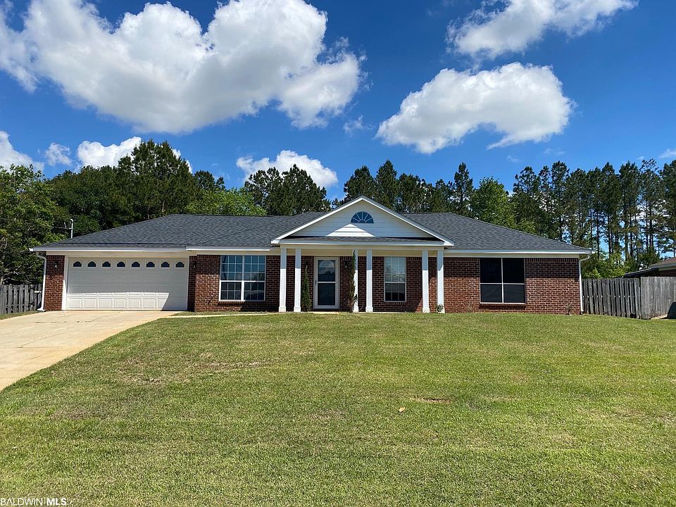 Welcome to this all-brick home, nestled in a charming and friendly neighborhood and no HOA dues! With 3 bedrooms and 2 baths, this home is perfect for families of many sizes. As you step inside, you'll notice the lovely new plank flooring that runs throughout the entire home. The kitchen is complete with an island and appliances including a refrigerator, stove, microwave and dishwasher. The back door leads to a large fenced backyard, perfect for kids to play, dogs to roam, and even add a garden or pool. The brand new covered deck is ideal for entertaining guests and enjoying the outdoors.This home has been freshly painted inside with new cabinet hardware, some new lighting & new toilet in guest bath. The 2-car garage provides ample storage space for vehicles and other belongings. Additionally, the washer and dryer will convey to the new owner. Roof is only 4 years old. Located just 15 miles from the beach, 10 miles away from OWA amusement park and for those who love boating, the nearest boat launch is just 6 miles away. The Magnolia Springs Elementary school is conveniently within walking distance, making it perfect for families with young children. You will have peace of mind with a Home Warranty provided by the Seller. You won't want to miss this great home!