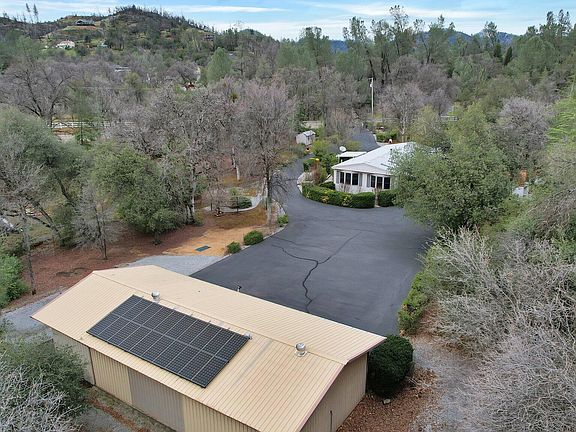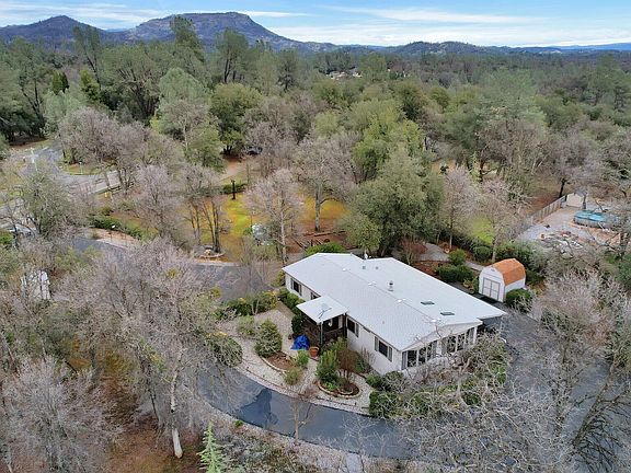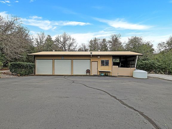 This well cared for 3-bedroom, 2-bathroom home offers a detached 3-car garage with a workshop, combining comfort and practicality. The kitchen features updated appliances and a cozy wood stove, creating a warm and inviting atmosphere. You'll love the spacious bonus family room with sliding glass doors that lead to a covered back porch - perfect for enjoying outdoor living. The beautifully landscaped property has mature trees (including plum and 3-in-1 cherry) and shrubs, creating a serene, park-like setting. With 2.61 acres of peaceful land, there's ample space for gardening. Multiple seating areas throughout the property allow you to relax and enjoy nature. Parking is a breeze with a paved driveway, three-car detached garage, and a carport attached to the garage. Additional storage is available in several outbuildings, ensuring plenty of room for all your belongings. The property also has a solar-powered gated entry, adding privacy. The Generac whole-house generator guarantees uninterrupted power during PG&E outages, keeping your home running smoothly. Water is supplied by the Bella Vista Water District, and rainwater storage tanks and pumps are in place to help water the trees. The roof is just 3 years old, and with owned solar panels, you'll enjoy energy savings year-round.