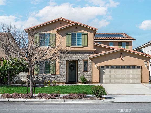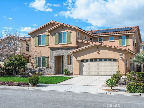 Beautiful Eastvale home with 6 bedrooms, 4 bathrooms, (2 bedrooms and 2 bathrooms downstairs),plus a den (could be home office or the 7th bedroom), a sunroom (195 Sf, not included in the total living area), 2 car attached garage. Great curb appeal, open living room with fireplace, remodeled kitchen with new quartz counter tops, large center island, resurfaced cabinets, stainless steel appliances, including GE built-in refrigerator, double ovens, kitchen hood and dishwasher. Formal dining room with custom chandelier. The enclosed sunroom with fireplace. Downstairs guest suite with separate entrance, equipped with kitchen, laundry machine, ideal for in-laws or tenant. Downstairs has another bedroom and bathroom. Upstairs has a loft, could be another entertainment area. Large primary bedroom with walk-in closet, primary bathroom with dual sinks, soak bath tub and separate shower. Other features include, custom two-tone paint, wood shutters , custom chandeliers, ceiling fans, recessed lighting, solar panels installed(under lease). Large back yard with planters and fruit trees. Great location, close to Eleanor Roosevelt High, parks, and shopping centers. Very safe neighborhood, has 24-hour security patrol.