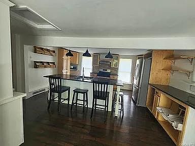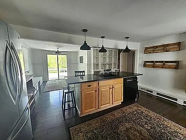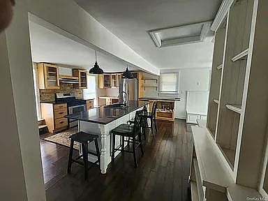 NO FEE Renovated 18th Century sunlit farmhouse located 5 minutes from the village of Rhinebeck near conveniences like grocery stores, shopping, movie theater, pharmacy as well as great local eateries. 5 mins from Rhinecliff train station, all schools, community pool, and library. 10 mins to the Taconic. The house is especially large (2,800 sq feet) with a ton of privacy. 12 total rooms. Upstairs features 2 beds, 1 full bath and an office. Downstairs includes a large open kitchen with a granite countertop and stainless steel appliances, another full bath, spacious entry room, formal dining room, spacious bedroom that can be converted to a TV room/sun room, two additional bedrooms and a 2nd office. Multiple accesses to the large rear deck and back yard with an enclosed child/pet friendly privacy fence overlooking the rolling lawn with towering trees, perennial gardens and a children's playset. Two-car, free-standing garage with EV charger available for an additional fee. Many updates include the kitchen and baths, Anderson windows and a newer roof. Owner pays for water. Renter pays for oil and electric. Landscaping and driveway plowing included. Pets allowed.