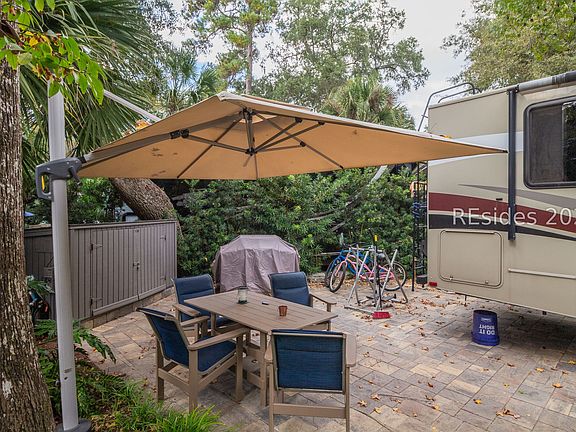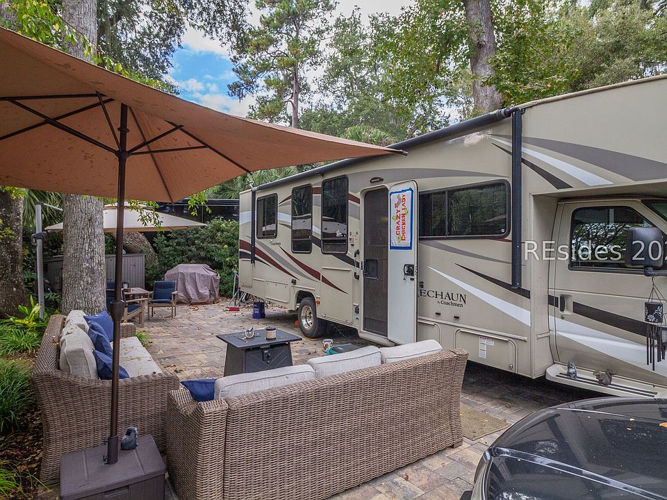 This beautiful RV Lot with paver pad, storage shed can accommodate a 45' RV with room for car in front. Both patio sofas with firepit, tables with 4 chairs and umbrellas, and shed will convey with the lot. Hilton Head Island Motorcoach Resort is a luxury RV resort consisting of 50 acres of woodland setting accented with lush landscaping settled in the heart of HHI and is a short bike ride to Coligny Beach, restaurants and shopping. HHIMR amenities include tennis courts, pickle ball, shuffleboard, pool, hot tub, clubhouse, laundry facilities, fitness center, basketball courts, playground, dog park, Wi-Fi, cable, and daily trash pickup