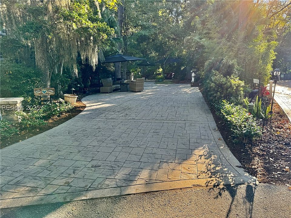 LARGE PERIMETER RV lot with a kitchen has a stamped concrete pad with a paver entertainment area and can accommodate a 45' coach and a tow vehicle.This lot comes complete with 2 entertainment areas,Kitchen with high-end appliances, irrigation, landscape lighting, 2 mounted cantilever umbrellas, newer pedestal, and a large storage shed.All furniture will convey with purchase.Hilton Head Island Motorcoach Resort is a luxury RV resort consisting of 50 acres of woodland setting accented with lush landscaping settled in the heart of Hilton Head Island and is a short bike ride to Coligny Beach,restaurants and shopping.