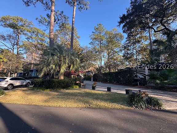 Do not miss the opportunity to own SPECTACTULAR RV LOT #206! Not only does this 3300+ sq ft lot have outstanding rental history, but the lot has a stamped concrete pad that can accomodate a 45' coach and 2 vehicles.This lot comes complete with 3 large cantilever umbrellas, dining table with 6 chairs, sofa with cushions and 2 matching chairs, fire pit, irrigation, landscape lighting, storage shed, and a newer pedestal. Hilton Head Island Motorcoach Resort is located in the heart of Hilton Head Island and is a luxury RV resort designed for the conveniences and enjoyment of class A, C and Super C Motorcoaches only. The resort consists of 50 acres of woodland and lush landscape setting accented with live oaks dripping with Spanish Moss, palms trees, ferns and flowering shrubs. The resorts amenities include tennis courts, pickle ball, shuffleboard, swimming pool, hot tub, clubhouse, laundry facilities, fitness center, basketball courts, playground, dog park, Wi-Fi, cable, daily trash pickup, lawn maintenance,water & sewer. Hilton Head Island Motorcoach Resort is a short bike ride to Coligny Beach, restaurants and island shopping.