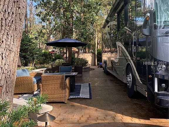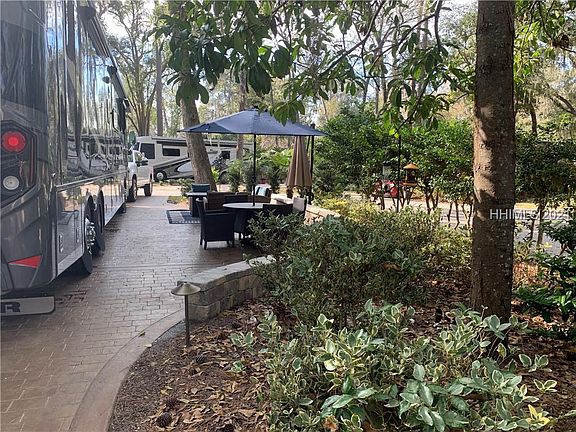RV lot #211 has stamped concrete pad with a new paver sitting wall and can accommodate any size coach up to 45' and room tow vehicle. New landscaping with irrigation system and outdoor lighting makes this the perfect lot to entertain. Outdoor sofa, 2 chairs, fire pit table, dinette and 4 chairs with umbrella, cantilever umbrella, and NEW Large storage shed will convey with property. Hilton Head Island Motorcoach Resort is a luxury RV resort consisting of 50 acres of woodland setting with lush landscaping settled in the heart of Hilton Head Island and is a short bike ride to Coligny Beach.