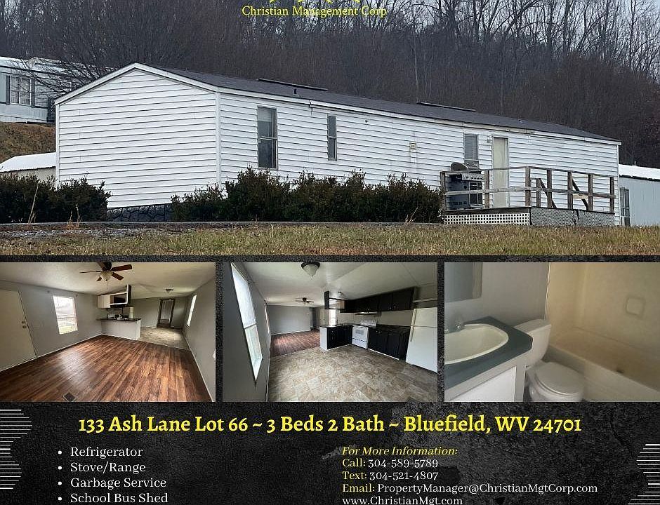 133 Ash Lane Lot 66 ~ 3 Beds 2 Bath ~ Bluefield, WV 24701 LEASE OPTION (Path to Home Ownership): Initial payment: $1,500 with no payments due until the 1st of the following month! Monthly payment: $750/month. Trash & lot rent are included. or RENTAL: Security Deposit: $750. Can be made in payments if needed. Monthly payment: $750/month. Trash & lot rent are included. Sorry, this home is not HUD approved. Three bedroom, two bath single wide for rent. Vinyl siding and shingle roof with a large front porch for entertaining! Large level lot with two car paved driveway. Open floor plan with living room, dining room and kitchen all open. Washer and dryer hook ups in laundry room. Outbuilding is included for extra storage. Master bedroom features separate door to master bath and garden tub. Second full bath is located inbetween both additional bedrooms. Central electric heat. New upgrades throughout home. Furnished with stove and refrigerator. Located in The Oaks MHP behind the Brushfork Armory in Brushfork, WV. Located at the bottom of the mobile home park, semi-private with no one directly in front or behind the home. Lot rent & trash included. Ready to be moved into! Christian Management Corporation Office Hours: Mon-Fri 9:00AM-5:00PM & 10:00AM-2:00PM the 1st Saturday of every month You can view THIS property 7 days a week! Most pets welcome with a $300.00 pet fee per pet and signed pet agreement. Maximum 2 pets. No aggressive breeds due to insurance restrictions. Clean, safe, quiet, crime & drug-free are our priorities for our residents! We support Equal-Housing Opportunities! Good people with good, bad, low, or no credit but stable employment or Social Security are welcome. -MUST pass background check -NO evictions in the last 7 years -NO sex offenders Is this property not what you are looking for? View our other available #homes, #mobilehomes, #apartments, and more on our Facebook or our website!