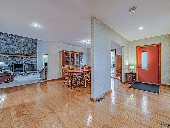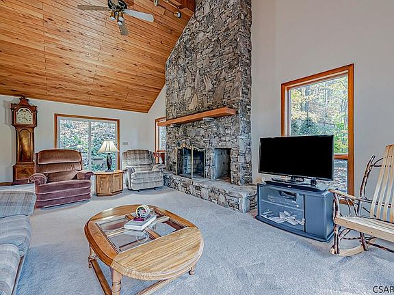 Enjoy year-round mountain living in this 2 story, 4 bedroom, 3 bath home located in Hidden Valley Resort! The main floor features a renovated kitchen with granite countertops and stainless-steel appliances, dining room with hardwood floors, living room with a large stone fireplace, great room with cathedral ceilings, additional guest bedroom, study, and a wraparound deck. The second floor offers a master bedroom with walk-in closet and master bath featuring a jetted tub and separate shower. There are two additional bedrooms upstairs and a full bath. The lower level has a 2-car garage and an unfinished basement with plenty of storage space. Home is located on nice wooded lot and in close distance to the slopes. Guard Home Warranty included.