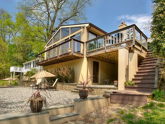 This spectacular, completely transformed, waterfront cottage on the Delaware River creates a Zen-like retreat with compelling riverside views. The serene panorama of natures wildlife brings the greater outdoors into your living space through walls of large sliding glass doors. The exterior of the property is field stone and stucco. To enhance the graciousness of the design, the home has copper gutters, downspouts, roof cresting and a rain chain. There are spacious upper and lower decks which can serve as private respites to take in the majestic beauty of this unique setting or to create a fabulous entertainment space which showcases nature at its best. Direct water access from a private beach allows you to tie your boat to your own dock. The interior presents a spacious open floor plan including a large living room with cathedral ceiling and a soapstone wood burning stove. The dining room features a cathedral ceiling and stone fireplace to warm any meal experience. The modern eat-in Chef's kitchen has granite counter tops and stainless steel appliances with ample storage space. The appealing layout presents two bedrooms and contemporary full bath and powder room. The master bedroom has french doors opening to a stone patio. The second bedroom has views of the river. Truly a home for those who value the river experience. Relax by fishing, kayaking, boating, biking or taking a lazy trip down the river on a raft. The outdoor buildings on the property provide a garage and ample room to store your water toys. Ideal as a weekend getaway, vacation home or year-round residence, this cottage is a rare offering 50 miles from Center City Philadelphia and 75 miles from Midtown Manhattan.