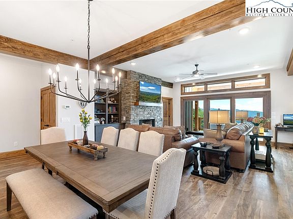 Discover the perfect turnkey mountain retreat with this stunning, fully furnished luxury condominium featuring high-end finishes and breathtaking views of the Johns River Gorge. This sophisticated single-level residence offers effortless accessibility via stairs or elevator, showcasing soaring 10-foot ceilings throughout and rich hardwood floors in all main living areas and the master bedroom. The expansive open living area captivates with beam accents and abundant windows designed to showcase panoramic views of the gorge, including a dedicated dining area and generous living room anchored by an elegant stacked stone gas fireplace. Step onto the spacious deck to experience mountain majesty while enjoying the built-in gas grill and cozy outdoor fireplace. The primary suite captures spectacular mountain vistas and features two closets plus spa-like master bath with oversized tile shower and double vanity, while the guest bedroom includes its own private bathroom. This maintenance-free condominium combines modern mountain architecture with rich finishes and comes completely furnished, allowing you to simply arrive and begin enjoying your mountain escape just minutes from downtown Blowing Rock.