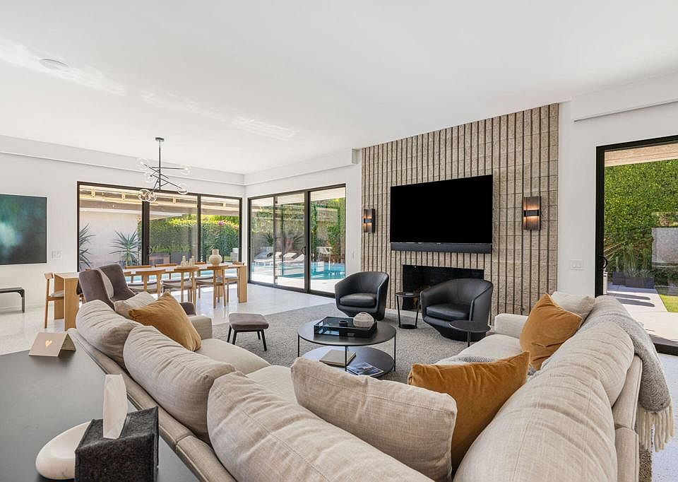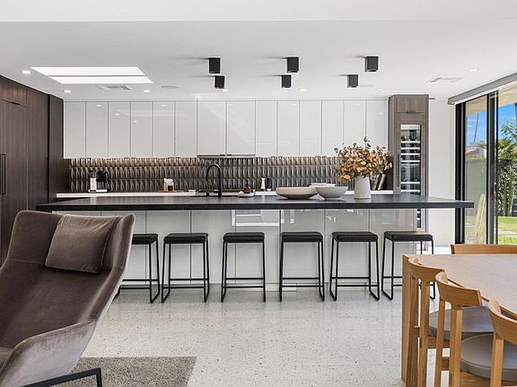 Welcome to this one-of-a-kind redesigned home in The Springs, where modern elegance meets ultimate comfort. The WOW factor starts at the impressive glass pivoting front door, setting the tone for the stunning interior that awaits. Gather your friends and family around the massive 12' x 7' honed quartz kitchen island, which seats 10--perfect for entertaining! This contemporary chef's kitchen boasts sleek white lacquer uppers and rich espresso lower cabinets, featuring top-of-the-line appliances including a 6-burner dual-fuel Wolf range, a 54'' Fisher Paykel built-in refrigerator, and a Gaggenau wine cooler.With large format Terrazzo porcelain tile flooring throughout, the home exudes a sleek desert vibe. The upgraded Level 5 smooth coat walls, Smart Home system with all AV equipment included, and power roller shades elevate the living experience to new heights. Each remodeled bathroom features designer-inspired finishes, while the primary suite is a true retreat, complete with a luxurious soaker tub and dry sauna.Step outside to discover your own private oasis. The expansive yard features new concrete sand finished pool decking, perfect for lounging and dining, along with a large private pool, spa, and fire pit--ideal for gatherings under the stars. This home is move-in ready and perfectly dialed in!