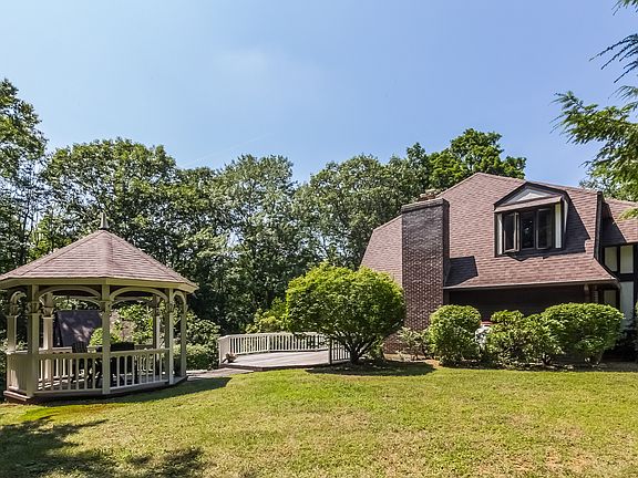 Located in desirable "Heatherwood", this attractive Pete Smith built home is beautifully maintained and truly one of a kind! The 4 bedroom, 2 ½ bath Tudor is surrounded by exquisite landscaping, stone walls and a circular stone driveway. A custom gazebo and deck, level yard and a barn add to its special charm. A stone walkway leads to a gracious Gothic stone entrance porch inviting you to step inside a large open foyer, expansive front to back living room with a gorgeous stone fireplace, which has a 38,000 BTU gas insert, easily heating the 1st floor on chilly winter days. The formal dining room with bay window and chair rail. Hardwood throughout the 1st floor, the large kitchen, with island and breakfast bar, looks out to the back yard and joins the family room, which has access to the custom deck and gazebo. A half bath off the foyer completes the first floor. The upper level is newly carpeted with 4 bedrooms, 2 full bathrooms and a hook up for a 2nd laundry. The lower level hosts the current laundry and three finished rooms, one with access to the outdoors, a great potential office space with windows overlooking the back yard. Two other finished rooms have low ceilings but work for play space, media room and/or storage. Access to the 2 car garage is via the lower level. Adjacent to hiking trails and trout-stocked Hammonasset River, the neighborhood is 2 miles from Roberts Food Center, 6 from downtown Madison, I-95 and beaches - a perfect setting for this enchanting home!