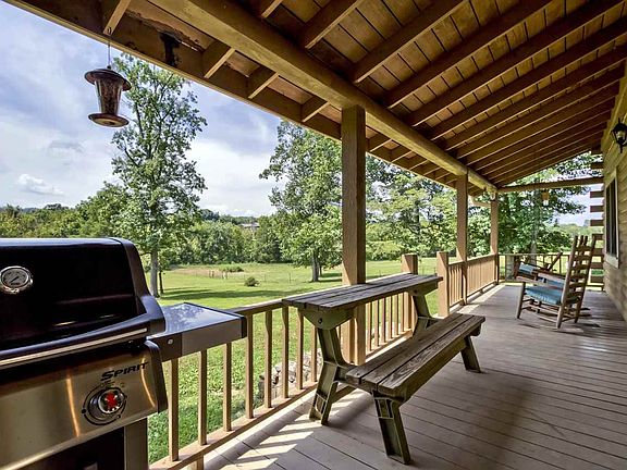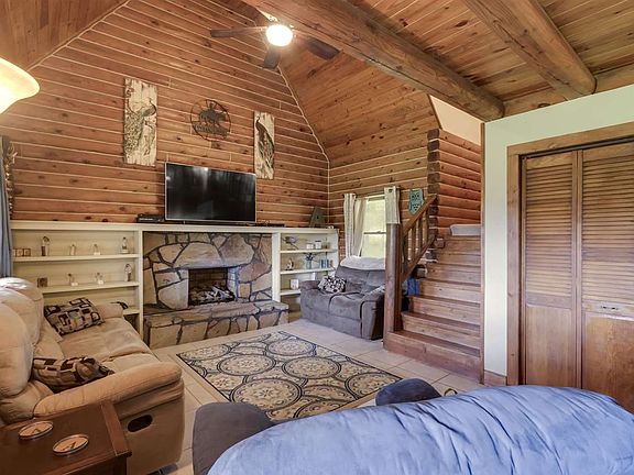 Come see this cozy log cabin nestled in the hillside! Only 5 miles from I-75, at the end of a dead end road. 16 acres: half pasture, half wooded, with a year around creek in the front of the property. Already fenced for farm animals with a newer 4 stall barn. The barn includes a hay loft, 2 tool rooms, a tack room, and a wash stall. The property also has an older 2 stall barn with hay storage and a chicken coop. There is an RV carport on a leveled concrete pad with water and electric hookups. The house features: custom oak kitchen cabinets, gas/wood burning fireplace, wood burning stove, central heat and air, full unfinished basement, and tile, carpet, and vinyl floors. Well water with city water available. 2 full bathrooms, with 2 bedrooms and a third smaller bedroom (currently used as a nursery, but was previously used as a large walk in closet. Located in the county, so LOW taxes and NO city tax!