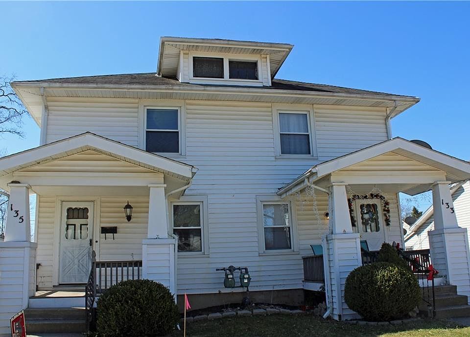 Very nice unique large double, east side unit w/detached 2 car garage and west side unit w/1 car detached garage. Large front porch for each unit.