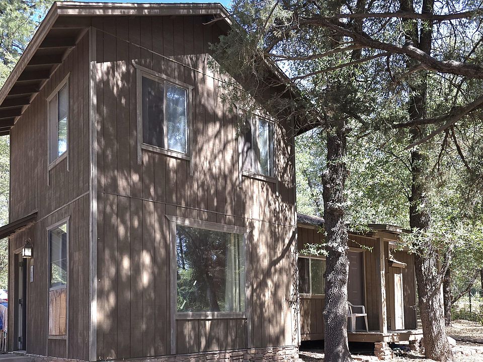 2 small CABINS on DENSELY TIMBERED ACRE. 2-story cabin built in 1997 and has HVAC system plus soap stove firewood burning stove; kitchen window box for growing herbs; full bath with combo tub /shower; saltillo tile; Tongue-In-Groove oak flooring on main floor; private bedroom upstairs and east-facing porch off the kitchen. Detached cabin was converted from a garage in 2018 - 2019 into a studio layout; has tiled floor; firewood burning stove; unfinished kitchen; walk-in tiled shower in the bath and attached laundry room with separate access door from the exterior. Acre lot is completely fenced for pets and/or livestock and has swinging pipe gate for security. Detached storage shed. 2 wells - both equipped. Septic system in very good condition with 2 new leach lines installed about 5 years ago. Property has a lot of wear and tear, plus some damage caused by animals; needs numerous repairs!