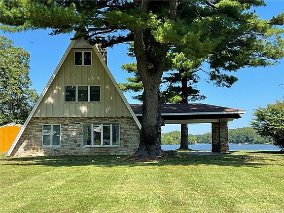 TURN KEY A-Frame located on the East Lake with amazing lake views!!! Recently extensively remodeled inside and out...Newer roof, windows, two central AC units, new concrete walks to a fire pit at the lake. Total redesign of the interior by Cochran Designs with the addition of the 2nd floor Master Bedroom and office or 3rd bedroom with private bath. Kitchen complete with granite counters and tile backsplash and attractive stainless appliances. Open dining area with charming living room that has a stone fireplace and stone accents inside and out. Main level bedroom with a full bath down with walk-in shower . Separate laundry/utility room on the main level. Extremely tastefully designed and quality finished. Wonderful lakeviews on both levels and tucked back off the road for privacy. Patio and concrete deck/seawall at the lake and shared boat ramp as well. Newer storage shed. Owner will take a few personal items but this wonderful home is being sold fully furnished so would be fabulous as a 2nd home too!! CALL SOON!!!