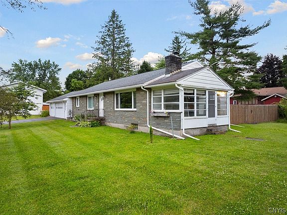Location! Location! This sprawling ranch home offers 1500 square feet of living space with 3-4 bedrooms, two full bathrooms,1 half bathroom and full finished basement. Privately situated on almost a half acre you will fall in love with this charming one floor living as you admire the curb appeal of classic stone exterior,attached three stall heated garage,fully fenced yard,and location at the end of the road with a hint of woods and nature. Grand living room is cozy and inviting with its large windows and fireplace, continue to peek around the corner where the sunroom is with another stone fireplace is but this one is a outside grill for all your cookouts. Kitchen boasts granite countertops and pantry with adjoining formal dining room for all your families gatherings. There are 3 spacious bedrooms and bathroom on first floor. Full basement is partially finished with lots of space to make that game room or extra family area. There is a potential for another bedroom and a full bathroom that is already done. Home was just fully painted, new windows were installed in bedrooms,new hot water on demand system and all the floors have been refinished making it move in ready for your family!