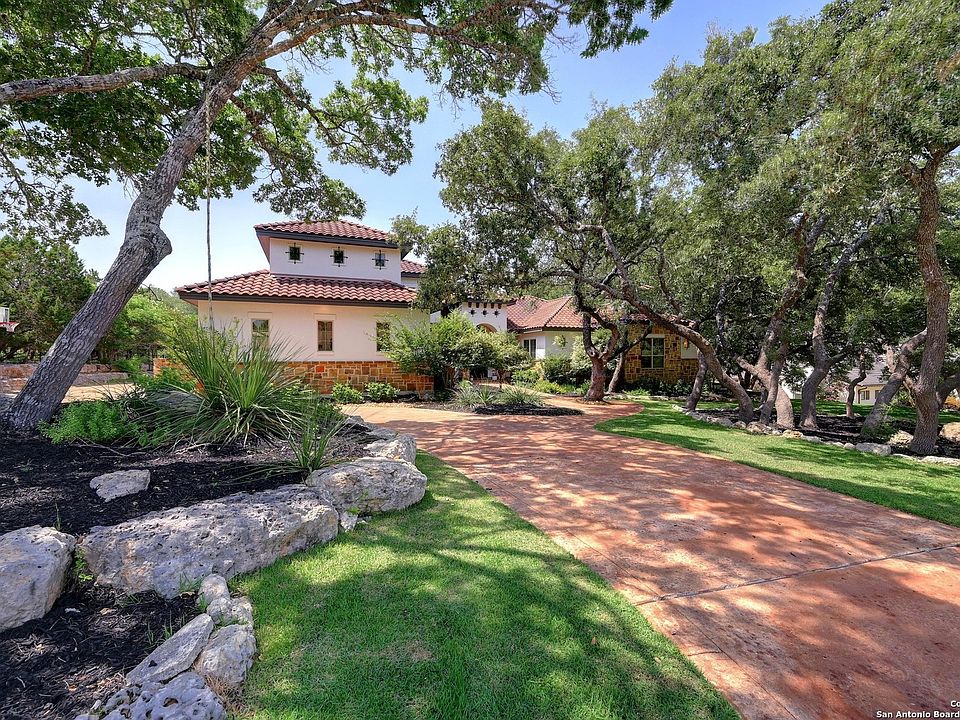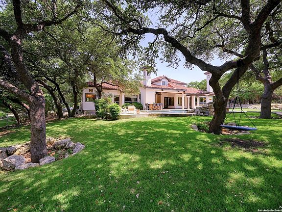 Tucked away in the stunning Menger Springs gated community, this stunning 5 bedroom, 4.5 bath home offers rare luxury and privacy. Built in 2007 by Mattern & FitzGerald, this 4,602 sqft property sits on a 1.04 acre lot, offering a serene retreat while maintaining easy access to I-10. Step inside to find a spacious, open layout with stained concrete floors throughout the main level and wood flooring upstairs. The chef's kitchen is a masterpiece, featuring granite countertops, and high-end finishes. The living area boasts a cozy fireplace, while the separate dining room features a custom wine cabinetry with a rolling ladder. The home's thoughtfully designed floor plan features three bedrooms downstairs and two upstairs, making it perfect for multi-generational living. The primary suite is a sanctuary, offering spa-like luxury and ample storage, and the media room comes equipped with a Black Diamond premium glass HD/4k projector movie screen and Epson HD projector with recent bulb upgrade. (speakers and components are excluded) Step outside to an entertainer's paradise, complete with a remarkable pool and spa with a recently replaced variable speed pump, a covered patio with an outdoor TV, and a wood-burning fireplace. The professionally built wood-burning pizza oven can hold 12 pizzas and reach 700F, making it a showpiece for gatherings outdoors. Enjoy evenings around the outdoor fire pit, surrounded by mature live oak and crepe myrtle trees. Additionally the large, fenced backyard has rare deep setback for extra space, and the three-car garage with epoxy flooring and fresh paint, easily accommodating oversized vehicles. The exterior has been freshly repainted, there is a RainBird irrigation system, outdoor landscape lighting, outdoor shed for lawn equipment, and a recently serviced water softener. The property is located on a quiet, low-traffic, cul-de-sac street, allowing this home to offer a peaceful lifestyle with wonderful neighbors in a prime location. Don't miss this rare opportunity to own a one-of-a-kind estate in one of the area's most desirable communities! Schedule a showing today.
