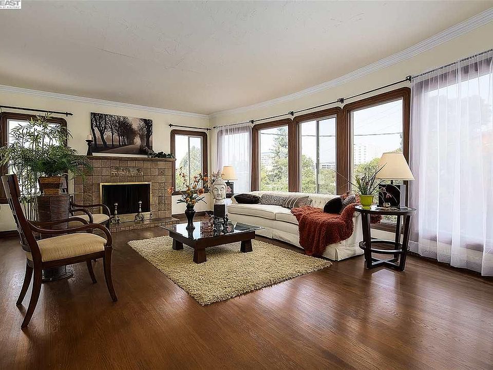 Mediterranean home with fabulous architectural details starting from nearly floor to ceiling windows in the living room, vintage tile with Mission images around the fireplace, incredible built-in china cabinet with beveled glass in the dining room, arches, wood window trim, newly refinished hardwood floors. Garage was used as overflow entertainment area with a bonus room and full bath (possible use as au pair or room for rent with private entry). Near Lake Merritt, Whole Foods. Easy access to I-580. New furnace 2015.