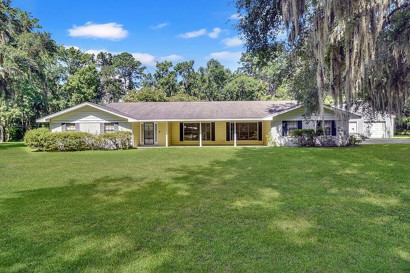 Welcome to your private retreat! Tucked away at the end of a quiet dead-end road, this exceptional property offers 3,551 square feet of combined living space between the spacious main home and the charming guest house - adorned with majestic oak trees and mature plantings. Main Home: 2,174 Sq Ft brick home with 4 Beds, 2.5 Baths. The main residence offers a welcoming layout that includes a formal living and dining room, a cozy family room with a brick hearth fireplace, and an extra-large kitchen featuring abundant counter space, cabinetry, and a big pantry, ideal for both daily living and entertaining. A laundry room, attached two-car garage, and additional storage add to the home’s functionality. Enjoy quiet mornings on the rocking chair front porch and relax or entertain under the covered back patio overlooking an 18x36 in-ground pool with a slide and safety fencing. The roof and HVAC are approximately 4-5 years old on main house. Guest House: 1377 Sq Ft Cinder block - 3 Beds, 1 Bath with Full Kitchen & Bonus Room - Perfect for extended family, guests, or rental potential - the detached guest house features its own living room with fireplace, a full kitchen, three bedrooms, a full bath, laundry area, and a large bonus area offering flexible use. Schedule your private showing today!