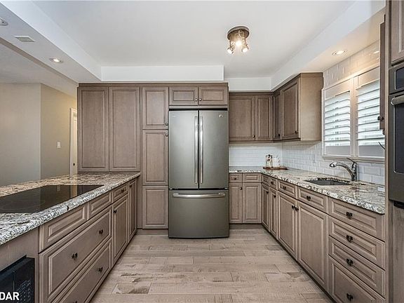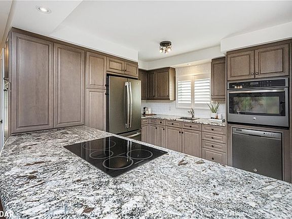 This is one home you don't want to miss! This completely updated raised bungalow is tucked away on a quiet crescent close to shopping, restaurants, and schools. Freshly painted and upgraded top to bottom, this home offers peace of mind with nothing with left to do but move in and relax. From the moment you arrive, manicured perennial gardens set the tone for the pride of ownership throughout. Inside, every detail has been thoughtfully updated with timeless, high-end finishes. Hardwood flooring and California shutters flow through the main level. The chefs kitchen features abundant cabinetry, a pantry, granite counters, tile backsplash, glass cooktop, and matching GE Profile appliances. Overlooking counter seating, the dining area, and great room, this kitchen makes entertaining effortless. The great room is anchored by a striking stone fireplace, flanked by oversized windows with charming bench seating that fill the space with natural light. Down the hall, past the updated 2-piece bathroom, is the primary suite, a true retreat! This oversized bedroom offers a walkout to the deck, an extra-large closet, and space for sitting or reading. The spa-like ensuite includes a double vanity with stone countertops and a glass walk-in tiled shower, another example of the top-to-bottom updates that make this home feel brand new. The lower level offers a separate entrance, kitchenette, and a 4-piece bathroom. Two generous bedrooms with large above-grade windows provide plenty of natural light, ideal for in-laws, guests, or rental potential. Outside, a two-tier deck provides multiple sitting areas with room to dine, lounge, and barbecue. Surrounded by mature trees, perennials, and a cozy fire pit, the backyard is the perfect place to unwind. This home truly leaves nothing to do but move in and enjoy.