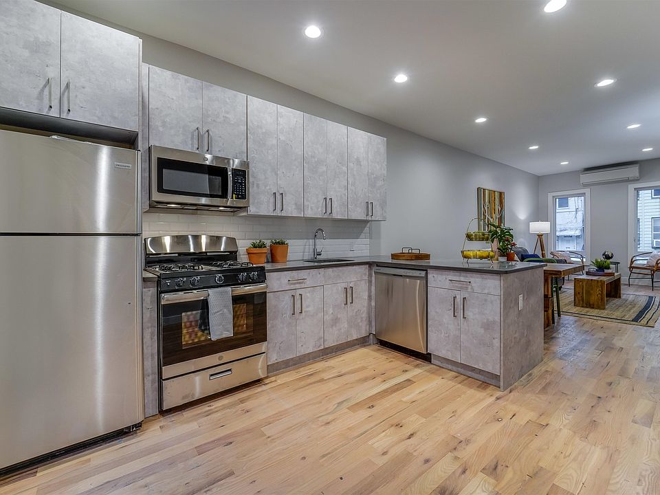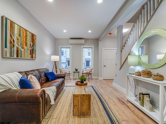 Luxury meets location, location, location in this renovated little slice of paradise nestled into the sweet spot of Jersey City Heights. White oak floors and big windows bathe this three-story condominium in light, while thoughtful finishes in the three-story town home layout make for ideal urban living. The main floor of this two bedroom, two bathroom home opens to formal living and eat-in kitchen featuring gorgeous dark grey quartz counters, classic bevelled subway tile backsplash, stainless steel appliances, recessed lighting and private terrace. Head upstairs to sizable bedrooms, both with walk-in closets, and master bath finished with wood grained cabinetry, slab floor tile, black matte fixtures and subway tile carry-through. Fully-finished front-to-back lower floor make for the ultimate flex space & provide ample storage; perfect for anything from game rooms or office space to informal living. Less than one block away from the heart of Central Avenue, this home is steps away to restaurants, shops, parks, great schools, and easy access to NYC / Journal Square, giving it both a residential feel with all the city lifestyle perks. One of two town home condominiums available at this location.