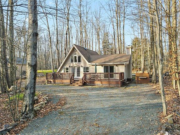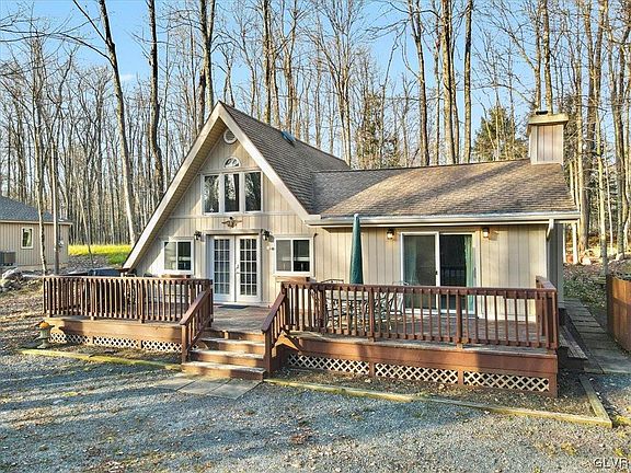 Nestled in Lake Naomi, an idyllic haven suitable for both vacation and year-round living, this 4-bedroom, 2-bathroom chalet-style home features an open concept with beamed cathedral ceilings, showcasing a custom eat-in kitchen designed for entertaining, complete with a center island, stainless steel appliances, and recessed lighting. Revel in the warmth of the exposed brick fireplace, the allure of vaulted ceilings, a convenient wet bar, and an abundance of natural light throughout. The master bedroom suite offers a luxurious custom tile walk-in shower. This energy-efficient property is perfectly situated within walking distance to the Community Center and North Beach. Outdoor features include a large deck and backyard fire pit, making this Lake Naomi chalet the epitome of fine relaxed lake living and capturing the essence of a truly welcoming and well-designed residence. Lake Naomi is an STR-friendly lake community located within close proximity to ski resorts, the Kalahari water park, shopping outlets, restaurants, Mt. Airy, and more. Book your tour today!