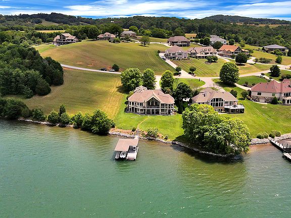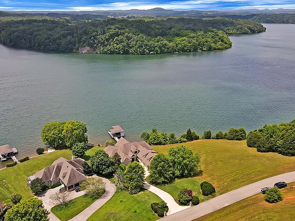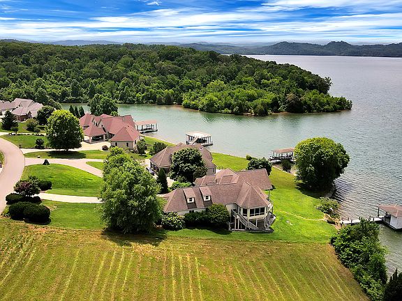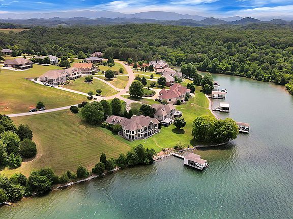 This luxury custom home is on the main channel of Tellico Lake, with unparalleled lake views; a private dock with boat and jet ski lifts. Over 5500 square feet of living area; 6 bedrooms, 4 full baths, 2 half baths, 2 living rooms, bonus room, storage room, hot tub, 3 car garage, and irrigation system. Master bedroom suite on the main has large walk-in closet, spa-like tiled bath with heated floors, and granite counter tops. The main level living room has custom cabinets, fireplace, hickory floors and vaulted ceilings. The custom kitchen has granite countertops and high-end appliances, including a 5-burner gas stove. Downstairs living room has fireplace, custom cabinets and a granite countertop bar. Outdoor living areas feature a covered porch and large screened porch with 180 lake views.