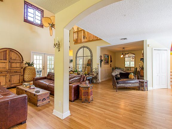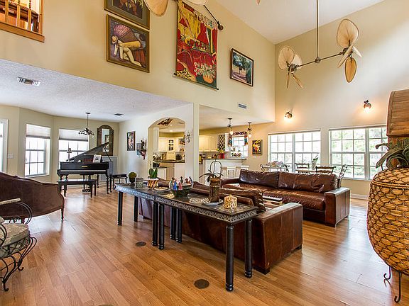 Welcome to paradise in one of the larger properties in the community with waterfront point lot appeal surrounded by a tropical private tranquil setting. This meticulously kept 2-story home has the designer touches throughout, laminate flooring, volume cathedral ceilings in the living room/ Great room with dual Bahamian-style paddle vans that create the inviting stately open space appeal of this aesthetically pleasing home. The chef's kitchen has all the look and working space and features you have been looking for, including granite counters with full designer tile back splash, built in desk area, designer in trend white cabinets with built-in wine rack, wall convection oven and microwave, center island with cook top and extra cabinets, Sinkerator insta-hot water and filter system.