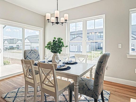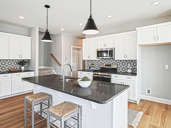 This 2-story, end-of-row townhome includes a first-floor owner’s suite, 2-car, rear load garage and a mudroom entry with built-in lockers and bench. Stylish vinyl plank flooring flows throughout the main living areas. The living room, warmed by a gas fireplace with stone surround, opens to the kitchen and dining area with sliding glass door access to a rear patio. The kitchen is well-appointed with stainless steel appliances, quartz countertops with tile backsplash, and large center island. The owner’s suite, tucked quietly to the back of the home, features an expansive closet and a private bathroom with 5’ tile shower and double bowl vanity. A laundry room is conveniently located across the hall from the suite. On the 2nd floor is a loft, two additional bedrooms, and a full bathroom.