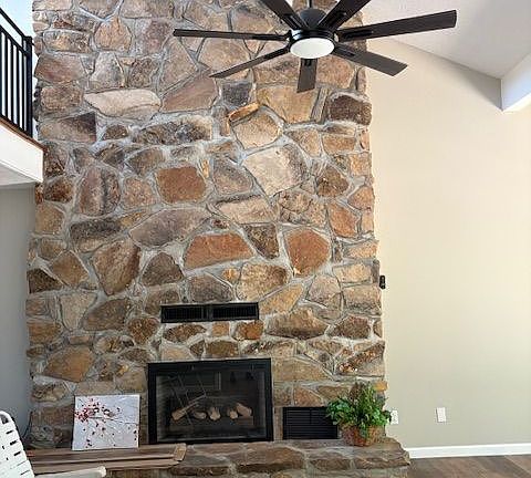 The large primary bedroom with walk in closet and bath are on the main floor. There is also a sun room area. The living room, dining room, kitchen and a half bath are also located on the main floor. The upstairs has 2 additional bedrooms and a full bath and a balcony area overlooking the living room and beautiful stone fireplace. The 1.78 acre lot is fenced in and has a 30x40 shop with electric and remote garage.