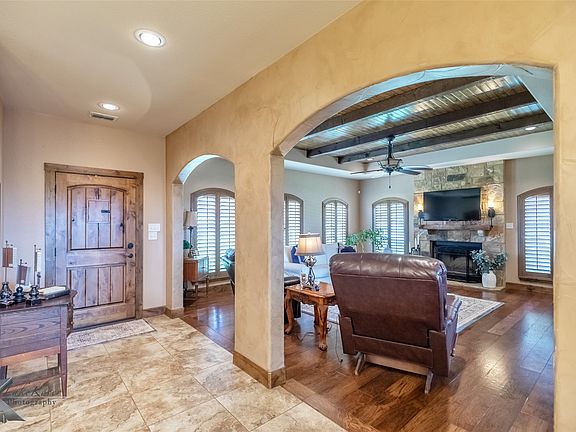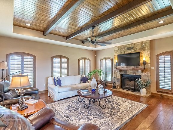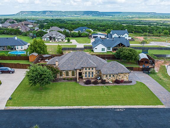 Beautiful custom-built 4-bedroom, 2-bath home located in the desirable Sandstone subdivision within Jim Ned ISD. Situated on a spacious ½-acre lot, this home features a striking stone and stucco exterior with gutters and impressive curb appeal. Inside, you'll find engineered hardwood flooring in the main living areas, tile in the bathrooms, and carpet in the bedrooms. The open floor plan includes a living area with cedar beams and a cozy wood-burning fireplace. The kitchen is well-appointed with stainless steel appliances, granite countertops throughout, and abundant cabinetry, ideal for everyday living and entertaining. The primary suite offers a luxurious retreat with dual vanities, a jetted tub, a separate tiled shower, and a spacious walk-in closet. The guest wing includes three bedrooms and a well-designed guest bathroom with dual sinks and a tiled tub-shower combo, providing comfort and privacy for family or visitors. Additional highlights include plantation shutters, a covered back porch, sprinkler systems in the front and back yards, and a backyard workshop with electricity and a mini-split unit, perfect for year-round use. This home combines quality craftsmanship with thoughtful design.