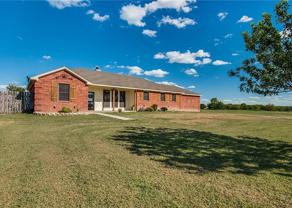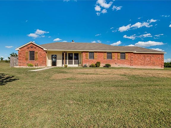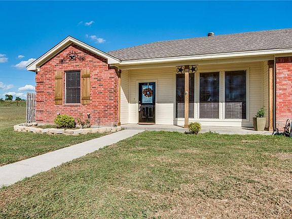 What a deal! 5 flat and level acres perfect for your small ranch. Property has a creek at the back of the property with more acreage on the other side of the creek as well. Home offers 3 bedroom, 2 baths with a large 2 car garage. Split bedroom floor plan, wood burning fireplace, his and her closets in master bathroom, nice size master bedroom, big utility room and a small office or coffee bar area. Lots of cabinets in the kitchen, landscaped, fiberglass volleyball pool and cozy country front and rear porches. Storage building out back to remain as well! Don't let this one get away, take a look and make it yours! Peach & Pear trees are also producing on the property between home and FM 2264!
