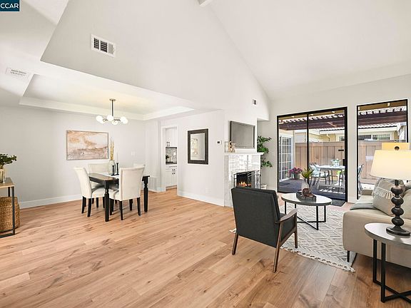 Upon entering this rarely available single story townhouse in Rancho Dorado, you'll immediately notice the vaulted ceilings in the living area, allowing for abundant natural light, along with a central wood burning fireplace with gas starter. A formal dining area is adjacent to the living room, as is a private rear patio. The kitchen has been recently re-done with new shaker style cabinetry, LED lighting, quartz countertops, and new GE appliances including a gas range. Enjoy the abundant counter space and pantry cabinet, as well as a convenient breakfast nook overlooking the rear patio. Along the other side of the home, an oversized primary suite awaits you, including ample closet space and updated primary bath, with tiled shower, new vanity with double sinks, and updated fixtures and finishes. The hall bath also includes a new vanity, quartz counters, faucet and lighting. New vinyl plank flooring has been installed throughout the home. Perfectly located, convenient to BART, trails, Heather Farms Park & Countrywood Shopping Ctr. HOA amenities include a community pool & tennis courts.