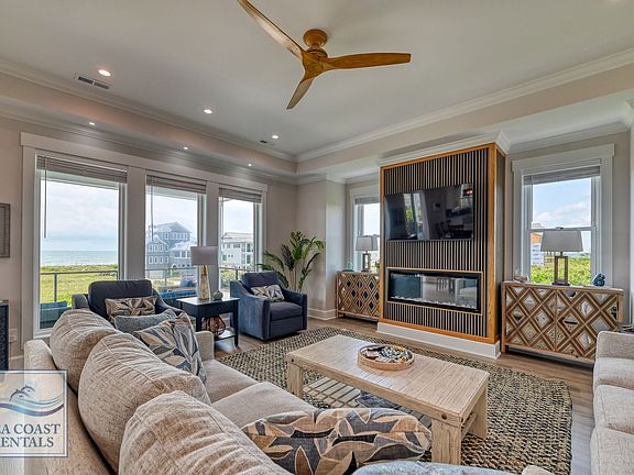 Short Term Only. Send us your desired dates of stay: availability is subject to change. This Ultra Premier property is available for executive high end monthly rentals during the off season at North Topsail Beach. This extensive home is a resort unto itself with water views of both the sound and the beachfront. No expense was spared in the construction of this brand new luxury build. Perfect for a casual beach lifestyle without sacrificing any of the comforts and quality of a sumptuous home. Located in a gated community, this 5,100 sq ft, 4 story home offers stunning views of the ocean and intracoastal waterway from its' numerous balconies. You have private community beach access, enclosed garages and parking for 12. It will truly become a home away from home with 8-bedroom suites, all with ensuite bathrooms! There's plenty of room for the whole family with 7 king beds and 2 twin over full pyramid bunks plus 2 queen sleeper sofas, 24 people can sleep comfortably. If you love to cook or even if you don't, you will appreciate the beautiful gourmet kitchen. There's a 10-foot island for food prep and space for 6 additional seats if needed. With a 48-inch gas stove, double ovens, microwave, 2 refrigerators, 2 dishwashers, ice maker, and even a pot filler; a chef will want to prepare all the meals here. Additionally, there's a wet bar and wine fridge for those fun cocktails at happy hour. Family dining is easy with 2 dining tables that can seat up to 24 plus an outdoor dining area just off the dining room for those who prefer al fresco dining. We haven't even mentioned all the fun you can have both inside and out! Aside from the beautiful beach and ocean, you never have to leave the house to enjoy a fun filled day. There is a 40-foot by 25-foot private pool with a 10-foot tanning deck, a regulation sized Pickleball court, outdoor BBQ grill with prep area, covered outdoor living space with a TV and an outdoor shower. If you prefer to be inside, then you can enjoy the game lounge with an 85-inch smart TV, foosball table, coffee bar, beverage fridge and ice maker that are still steps from the pool. Other amenities include baby items such as pack N play, a highchair and booster chair along with 10 smart TVs throughout, 2 half baths, 2 laundry areas on separate floors and even ping pong in the garage. If you feel the need to leave The Big Dill, you'll only be 6 minutes from the closest grocery store and there are several shops and restaurants in the mainland town of Sneads Ferry and island town of Surf City. If golf is your game, the North Shore Country Club and Golf Course is minutes away and if you bring your boat or jet ski, a boat launch is even closer. Public access to kayaking and paddle boarding is a short drive away as well as playgrounds for the kids. Are you ready to have one of the best, most relaxing getaways ever? Now is the time to enjoy all that Topsail has to offer and to have The Big Dill Experience! We think you'll will say "It's kind of a Big Dill" to all your friends.